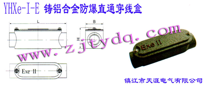 防爆電器 >> 防爆穿線盒 >> YHXe-I-E鑄鋁合金防爆直通穿線盒 AL-alloy Anti-explosion Pull Box of Straight Type 說明: 1、適用范圍: 爆炸性氣體混合物危險(xiǎn)場(chǎng)所:1區(qū)、2區(qū) Danger places with gas mixture:Zone 1&2 爆炸性氣體混合物:IIA、IIB、IIC Explosive gas mixture: IIA、IIB、IIC 溫度組別:T1-T6 Temperature group:T1-T6 戶內(nèi)、戶外 indoor,outdoor 2、產(chǎn)品特點(diǎn): 外殼采用鑄鋁合金,表面噴塑 The closure is made of Cast Aluminum alloy with the surface painting 如需要變徑時(shí)可特制 It can be fabricated according to the special requirements 防爆標(biāo)志:ExeII Explosion-proof Mark:Exe II 防爆等級(jí):IP55 Protection Grad:IP55 結(jié)構(gòu)形式多樣,便于安裝 Many kinds of structures are convenient for installation 3、YHXe防爆穿線盒根據(jù)客戶的要求,在不同的使用場(chǎng)所可選擇一下三種型號(hào):There are three specifications for different purposes 1)、YHXe-I鑄鋁合金防爆穿線盒 YHXe-I Explosion-proof Box of Cast Aluminum Alloy 2)、YHXe-II鑄鐵防爆穿線盒 YHXe-II Explosion-proof Box of Cast Iron Alloy 3)、YHXe-III鑄鋼防爆穿線盒 YHXe-III Explosion-proof Box of Cast Steel Alloy
